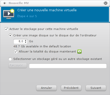 Cette étape permet de créer ou de sélectionner un disque dur virtuel. Dans notre exemple nous allons créer une image disque d'une taille de 8 Go.