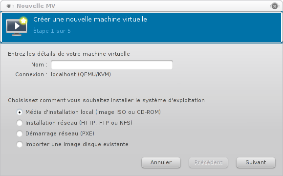 Permet de choisir le nom de la nouvelle machine virtuelle et son mode d'installation depuis un lecteur de DVD, une image ISO enregistrée sur le disque local, depuis le réseau ou en mode Boot PXE. Vous pouvez choisir le nom que vous désirez, cela n'a pas beaucoup d'importance.
