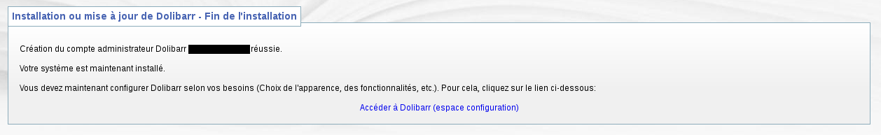 Sélection du paquet dolibarr précédemment désélectionné. (Lecture de la base de données... 116470 fichiers et répertoires déjà installés.) Dépaquetage de dolibarr (à partir de dolibarr_3.2.2+nmu1_all.deb) ... Paramétrage de dolibarr (3.2.2+nmu1) ... Run the dolibarr config script Ask for web server to setup Run the dolibarr postinst script Mysql superuser found to use is debian-sys-maint Create empty file /etc/dolibarr/conf.php Complete config of server apache2 Web user.group used is www-data.www-data Add link for Apache config file Restart web server using invoke-rc.d Reloading web server config: apache2. ---------- Call Dolibarr page http://localhost/dolibarr/ to complete the setup and use Dolibarr. ----------