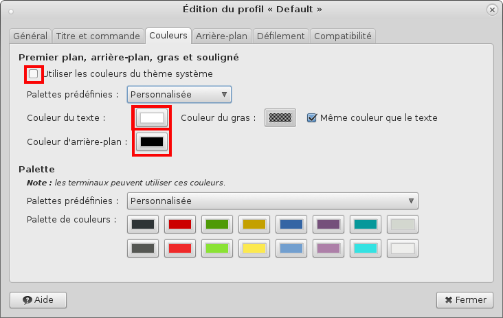 Voici un exemple avec les paramètres par défaut mais avec un changement de couleurs de l'arrière-plan en noir et de l'écriture en blanc. Attention de bien décocher “use-theme-colors”.