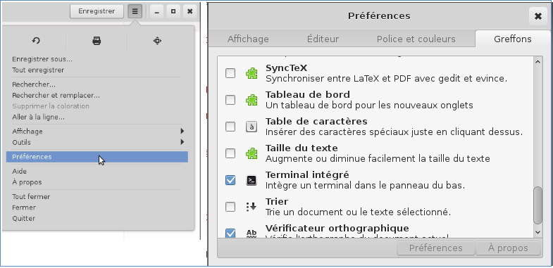 Nous pouvons utiliser les greffons déjà fournis avec Gedit mais aussi en rajouter. Pour installer les greffons supplémentaires et d'autres paquets utiles pour la configuration ouvrons un Terminal et faisons un copie/coller des commandes ci-dessous: