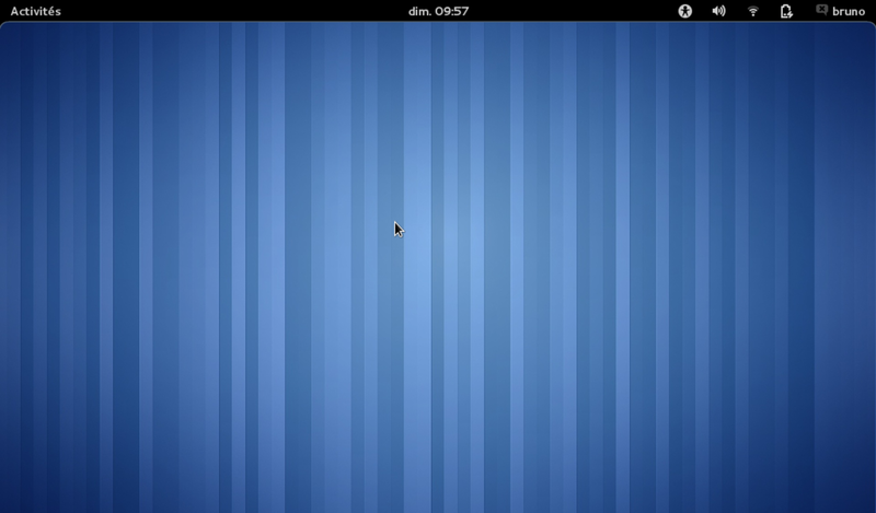 Plus d'icônes, plus de barre des tâches ni de gadgets, on découvre uniquement en haut du bureau le tableau de bord de GNOMEShell.