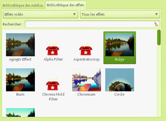 Dans l'onglet Bibliothèque des effets, vous avez la liste des effets que vous pouvez appliquer au projet. Toutefois, selon les paquets installés, certains effets ne seront pas valides.