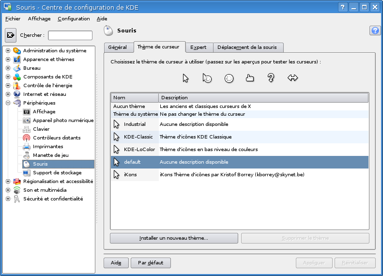 Aller dans Centre de configuration de KDE —→ Périphériques —→ puis Souris et ensuite —→ Thème de curseur