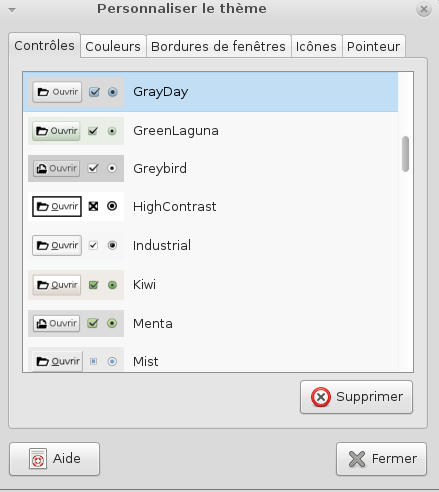 La fenêtré Personnaliser le thème est composé de 5 onglets qui nous permettent de configurer notre environnement de manières intuitive.