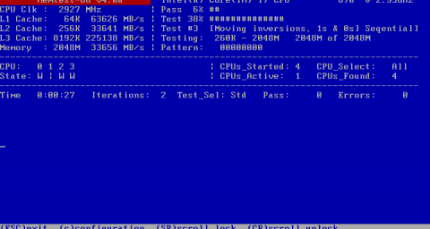 Une fois cette entrée sélectionnée memtest se lance automatiquement. Le test peut durer d'une dizaine de minutes à plusieurs heures