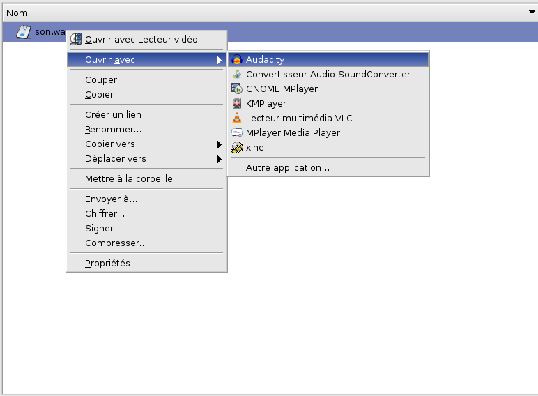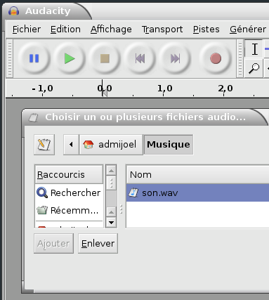 Puis en tapant au clavier Ctrl+O vous obtiendrez la fenêtre pour aller au fichier son.wav et l'ouvrir par clic gauche :