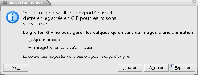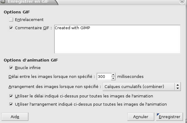 Nommez votre fichier avec l'extension .gif et remplissez les boîtes de dialogue comme ces images d'écran l'indiquent :