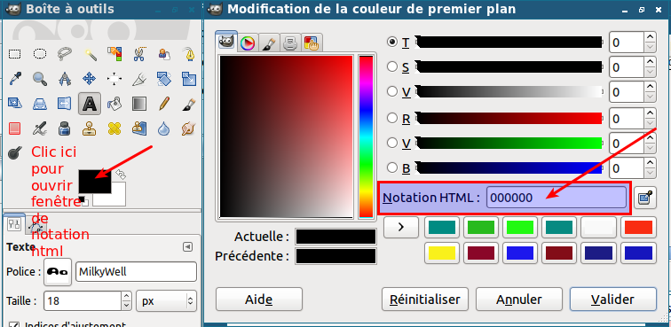 Avec l'outil texte T créez un texte à votre choix et remplissez le texte d'une couleur assez foncée. La notation html de la couleur que j'ai choisie est 008b82. Copier/coller cette notation à l'endroit indiqué et appuyez sur la touche de validation ↵ Entrée