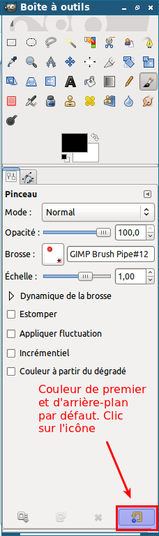 Remettez les couleurs de premier et d'arrière-plan de gimp par défaut dans la boîte à outils gimp en cliquant sur l'icône en bas de la fenêtre à droite: