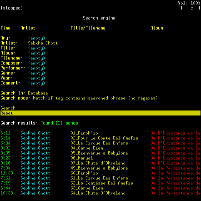 Vous pouvez vous déplacer dans la liste résultante avec les touches flèches ↓ et ↑ L'appui sur la touche ↵ Entrée place le morceau sur lequel se trouve le curseur à la fin de la liste de lecture courante et démarre la lecture de celui-ci. La touche Espace ajoute le morceau à la liste de lecture courante. La touche E permet d'éditer les tags du morceau courant dans le mini éditeur de tag.