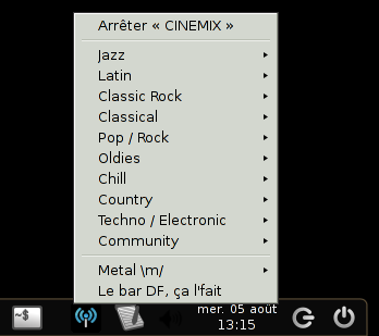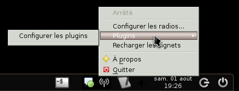 Le clic gauche sur l'icône donne accès au choix des stations tandis que le clic droit permet de configurer radiotray.