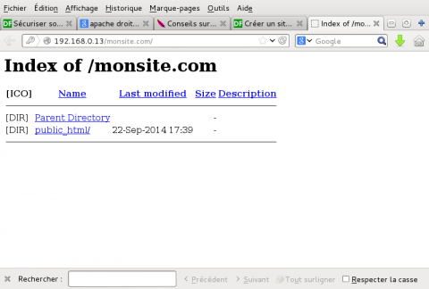 Index of /monsite.com [ICO] Name Last modified Size Description [DIR] Parent Directory - [DIR] public_html/ 19-Sep-2014 16:38 - Apache/2.2.22 (Debian) Server at 192.168.x.xx Port 80