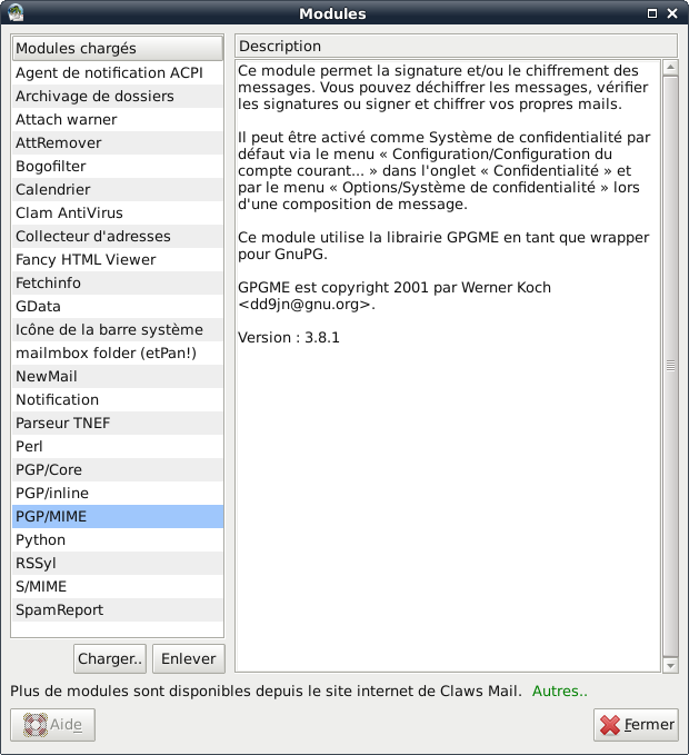 Cette fonctionnalité est fournie par le programme GnuPG. Le paquet claws-mail-plugins doit être installé et les modules OpenPGP (PGP/Core, PGP/Mime et PGP/Inline) doivent être activés. Les fonctionnalités de signature et de chiffrement de Claws Mail sont :