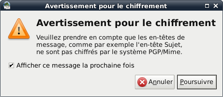 Un message d'avertissement devrait apparaître. Rien de grave, il faut simplement prendre en compte que le standard de chiffrement ne permet de chiffrer que le contenu du message mais pas l'en-tête avec le sujet.