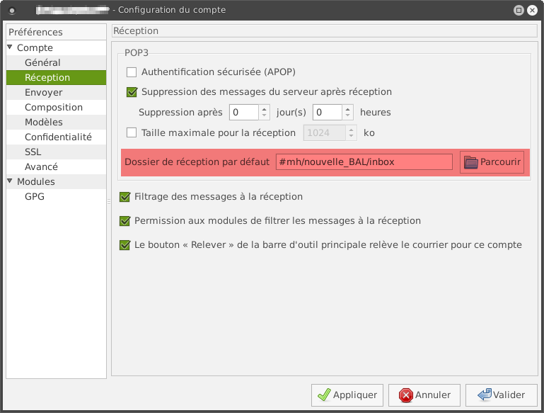 Au redémarrage Claws Mail affichera désormais nouvelle_BAL au lieu de ma_boite_mail. Cependant il reste une étape : si vous avez plusieurs boites aux lettres, le compte mail dont vous avez changé le nom de boite aux lettres ne retrouvera plus cette dernière lors de la réception de messages. Par défaut, les messages arriverons donc désormais dans la première boite aux lettres qu'ils trouveront.