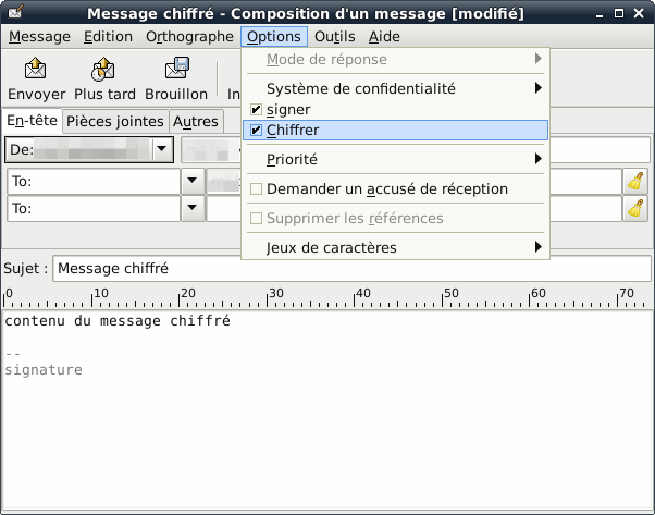 On va vérifier que la signature et le chiffrement fonctionnent correctement. Pour cela, le plus simple est de s'envoyer un courriel chiffré et signé.
