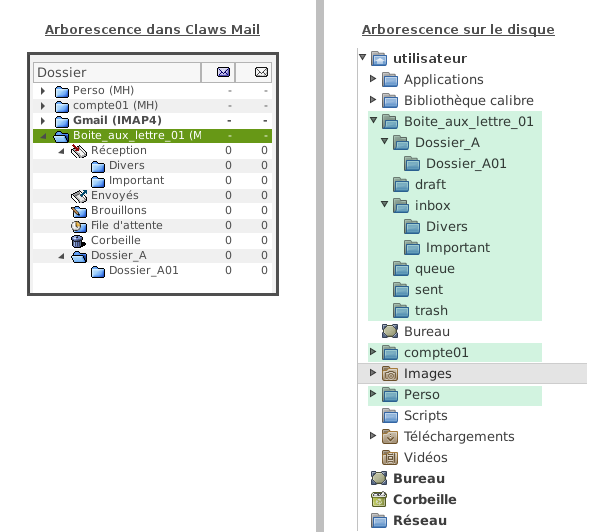 Les boites aux lettres sont au format MH (Mail Handling system), ce qui signifie que chaque boite aux lettres créée dans Claws Mail crée aussi un répertoire sur votre disque, dans lequel seront stockés tous vos messages (reçus, envoyés, brouillons, en file d'attente et supprimés), chacun sous la forme d'un fichier texte.