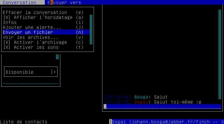 | Alt+A | affiche le menu de configuration de Finch (comptes, plugins, liste de contacts, etc.) |