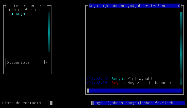 Finch est un logiciel de messagerie instantanée (IM) en mode texte/console. Il supporte de nombreux protocoles AIM/ICQ, Yahoo!, MSN, IRC, Jabber/XMPP/Google Talk, Napster, Zephyr, Gadu-Gadu, Bonjour, Groupwise, Sametime, SIMPLE, MySpaceIM et MXit et gère les connexions simultanées à plusieurs réseaux.