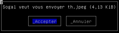 Pour recevoir un fichier, c'est encore plus simple! Une petite fenêtre s'affiche vous demandant si vous souhaitez ou non accepter le transfert (Attention, cette fenêtre peut parfois être masquée par les autres, n'oubliez de vérifier à l'aide de Alt+W (liste des fenêtres ouvertes).)