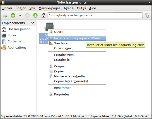 “Ouvrir avec l'installateur GDebi” (les termes peuvent changer légèrement suivant l'environnement utilisé MATE, XFCE, Gnome…)