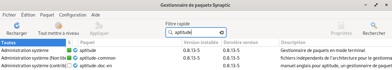Si toutefois le champ de recherche n'est pas visible, réinstaller Synaptic doit résoudre le problème. Un deuxième redémarrage après la réinstallation de Synaptic peut être là aussi nécessaire.