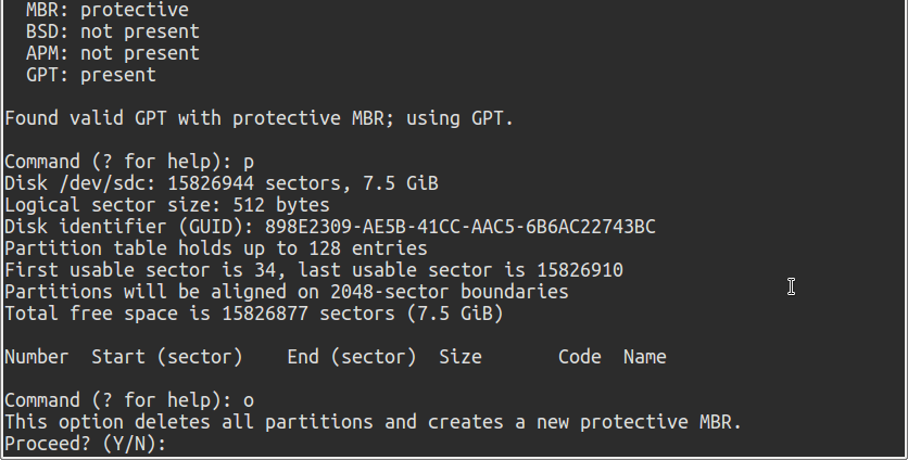 Tapez O pour créer une nouvelle table de partition vide au format GPT.