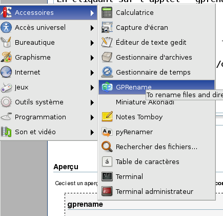 Sous gnome, nous retrouvons l'application gprename installée dans les Accessoires du menu Applications.