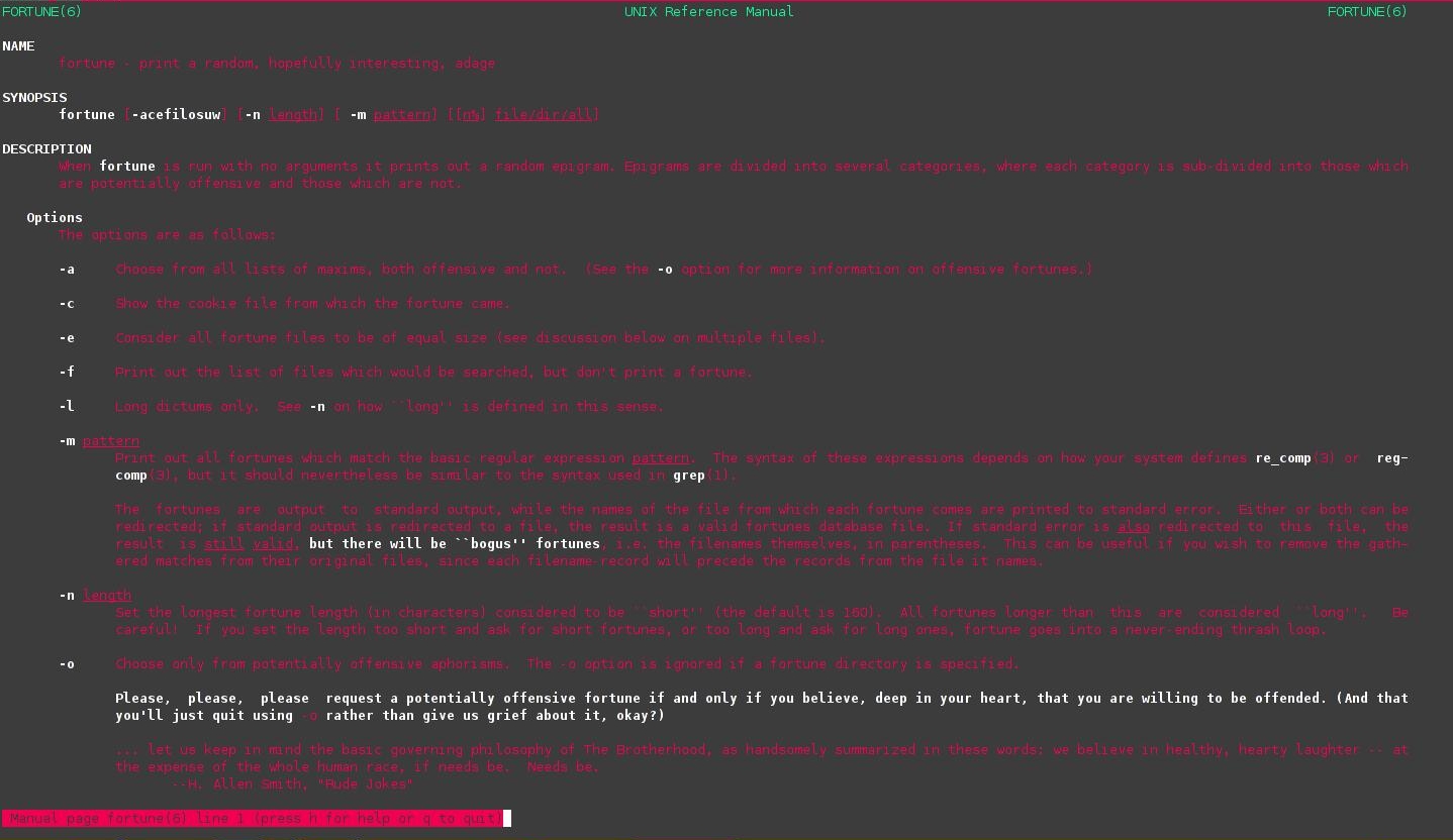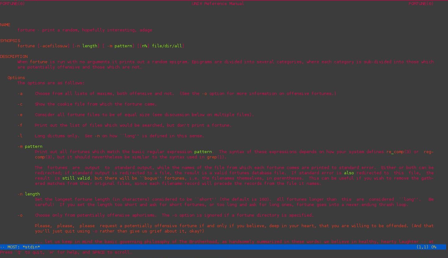 Par défaut, les pages de man sont lues par less, la lecture est austère. Pour avoir un peu de gaieté dans le déchiffrage de man, il vous suffit d'installer comme pager: most et de le déclarer comme pager par défaut pour votre compte.