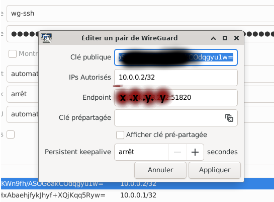 #nom du serveur [Peer] Endpoint = 99.xxx.188.xxx:51820 PublicKey = celle du serveur AllowedIPs =10.0.0.3/32