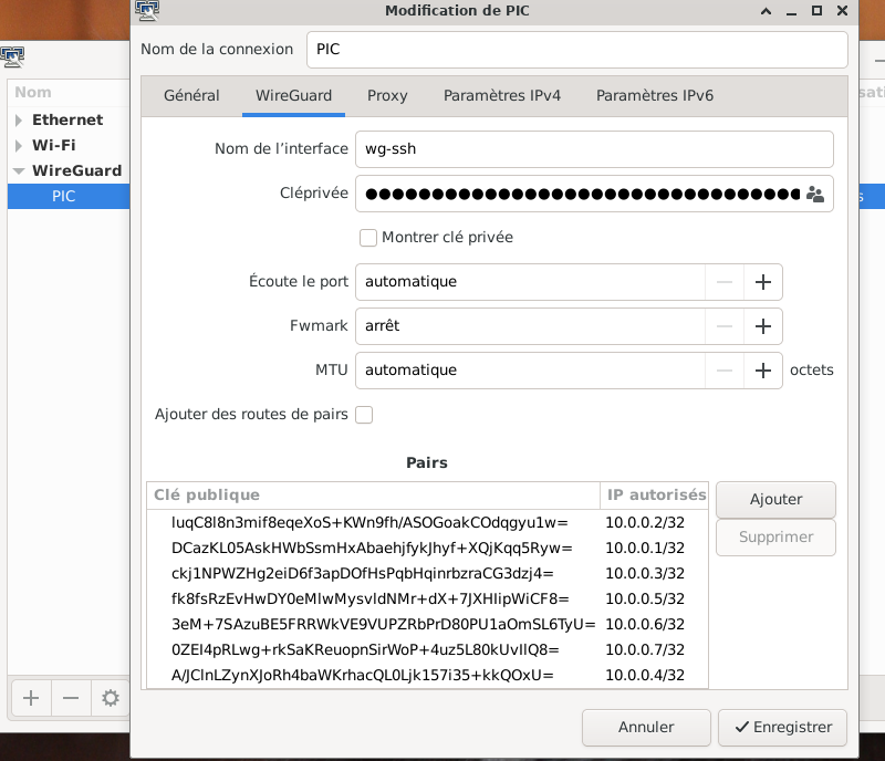 dans la case Pairs, cliquez sur Ajouter et mettez les clés publics et ip autorisées du serveur. et Enregistrer.