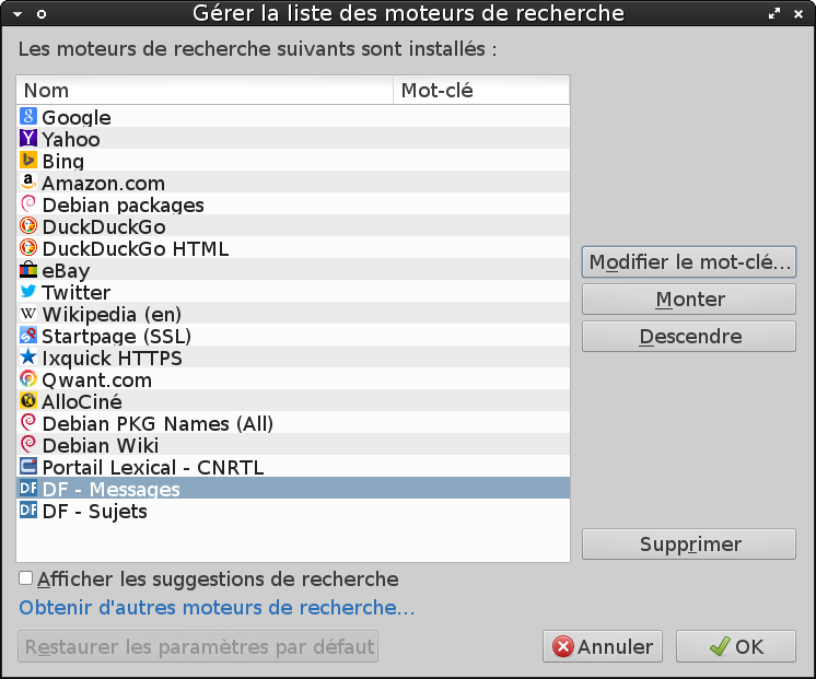 Il est aussi possible de modifier le moteur de recherche utilisé.