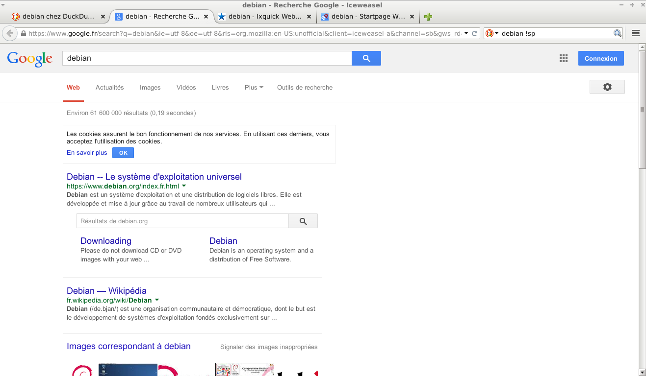 | Opérateur booléen OR | debian officiel OR facile | Recherche pour debian avec le terme officiel ou facile (on devrait retrouver le site officiel Debian et le site Debian-Facile) |