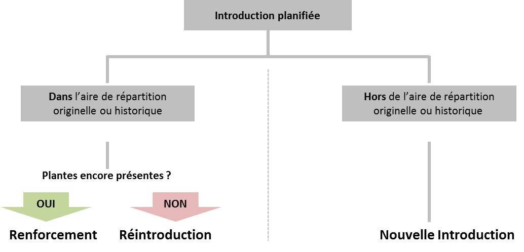 Dans le cadre d’introductions planifiées d’espèces (=conservation translocation), dont les objectifs sont de réduire la vulnérabilité de l’espèce ou de restaurer les fonctions du milieu, on distingue les introductions dans l’aire de répartition historique (=population restoration) et les introductions hors de l’aire de distribution historique (=conservation introduction).
