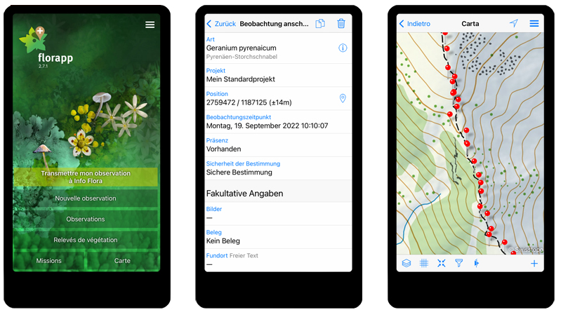 FlorApp est l’application d'Info Flora pour la saisie, directement sur le terrain, d’observations de plantes vasculaires (mousses, lichens et champignons) ; cela même en l’absence de connexion à Internet. Vous pouvez, par exemple, choisir dans quel projet vous souhaitez sauvegarder vos données et joindre des photos à vos observations. Cette App permet également de faire des relevés de végétation puis d'analyser le milieu naturel et d'enregistrer des tracklogs. Les listes d'espèces par carré 5x5 km et les Missions d’inventaire éclair sont visibles sur l’affichage cartographique. Avec une connexion à Internet, les données peuvent ensuite être transmises aux centres de données suisses compétents.