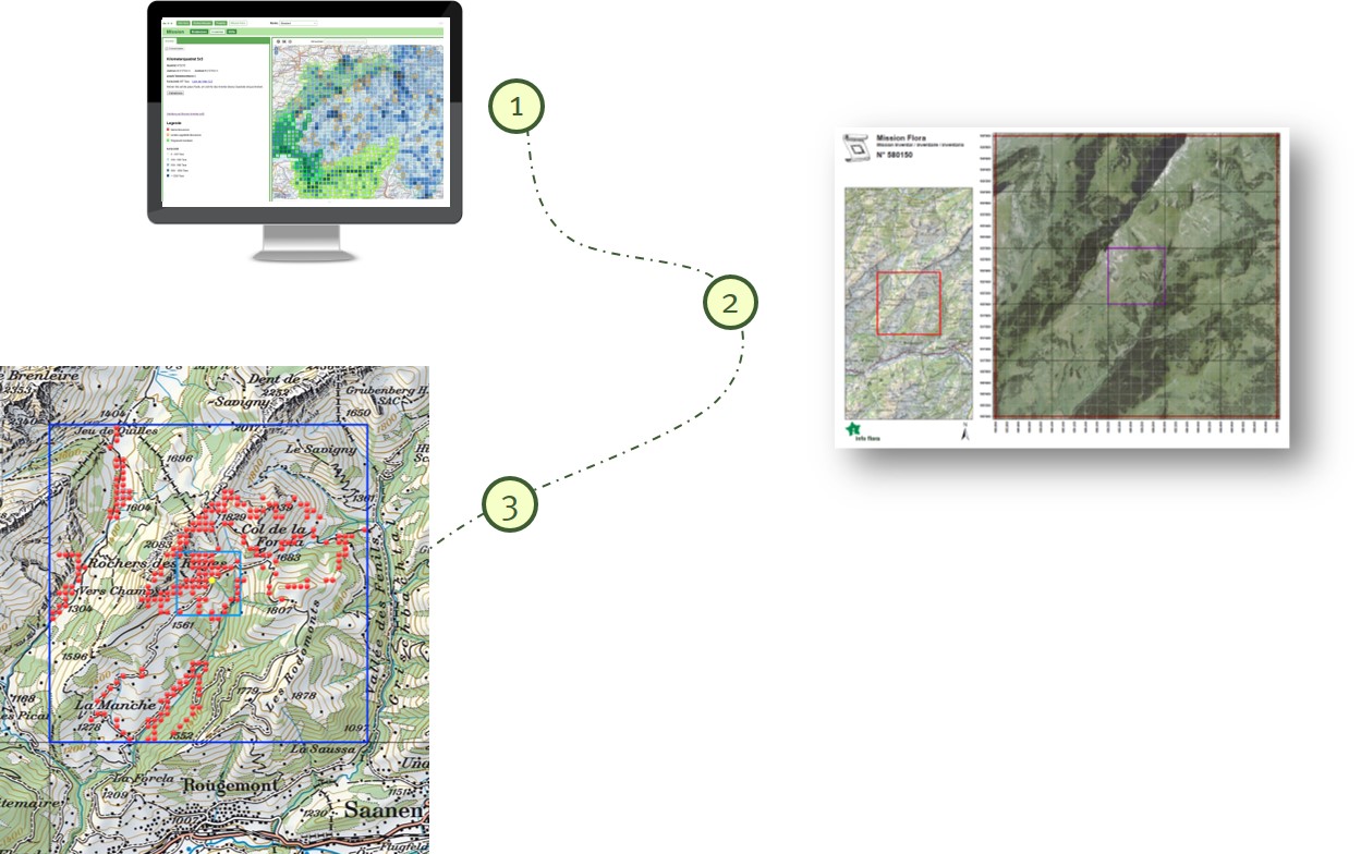 1) Choisissez un carré de 5x5 km (si possible un carré prioritaire) sur le carnet en ligne dans le domaine «Mission Flora» sous «Inventaire».